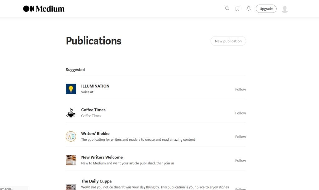 A Mediumon vannak házon belüli kiadványok, amelyek sokkal nagyobb közönség elé állíthatják történeteit, így több követőt szerezhet. Rengeteg kiadványhoz írhat, köztük olyanokat is, amelyek a webhely új íróinak szólnak.