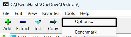 2.VálasszonOpciók…aSzerszámoklegördülő menü és folytassa a7-ZipAz ablak füle.