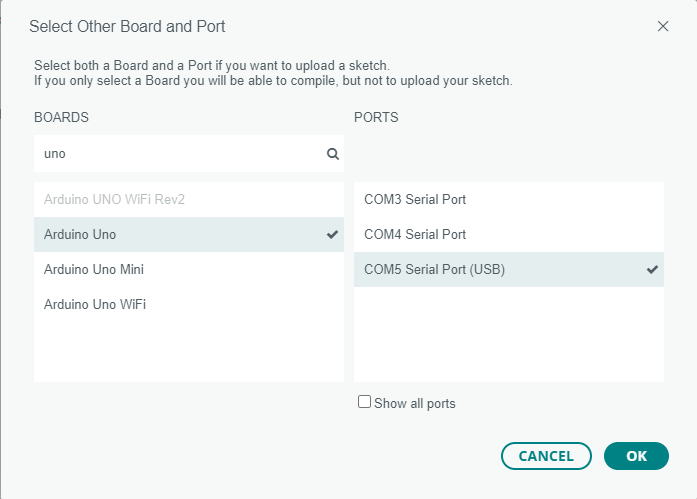 5.A listában kattintson a kiválasztott tábla nevére, majd kattintson arra a portra, amelyhez a táblát csatlakoztatta.
