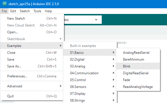 3.Ha tudja, hogyan kell kódolni Arduinóban, írja meg a kódot. Ellenkező esetben kattintson a gombraFájlok,majdPéldák, kattintson a választott beépített példára, és annak kódja megnyílik egy új vázlatfüzetben.