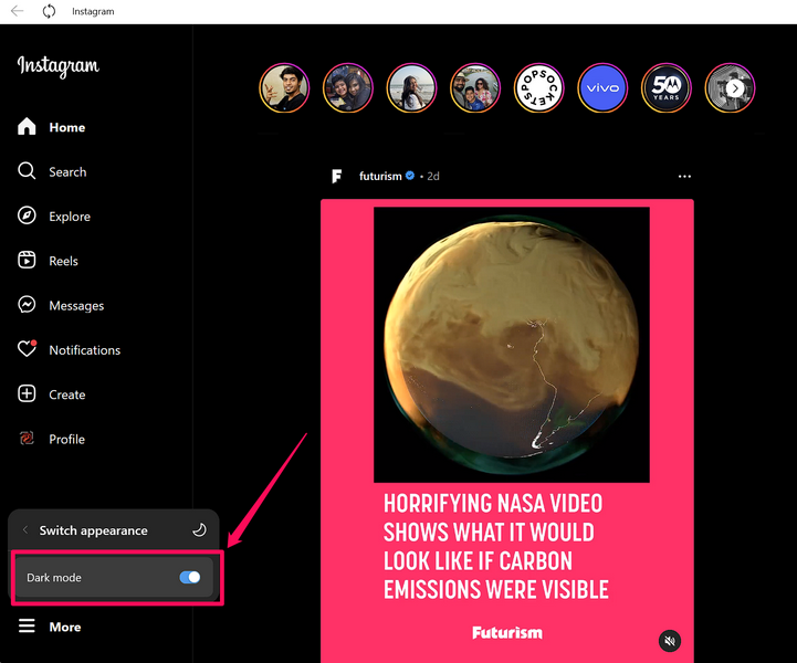 Most élvezze az Instagram alkalmazást egy sötét témával a Windows 11 készüléken.