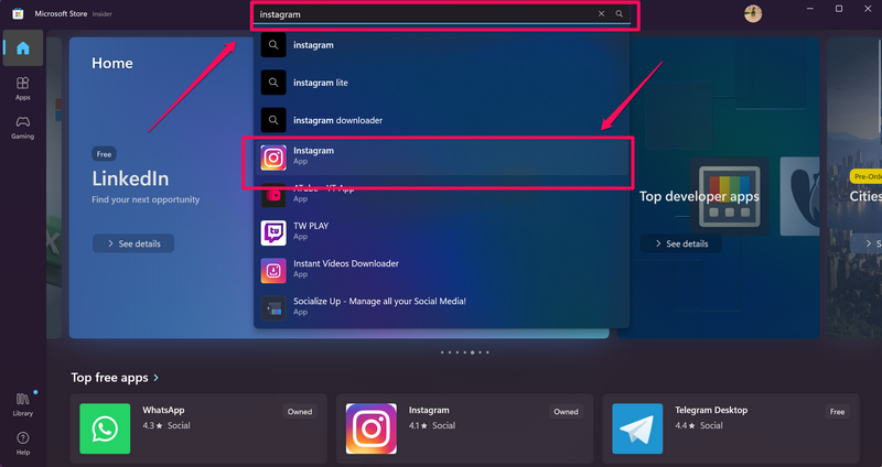 2.Használja aA keresősáv felettA Microsoft Store -banKeresse meg az Instagramot-
