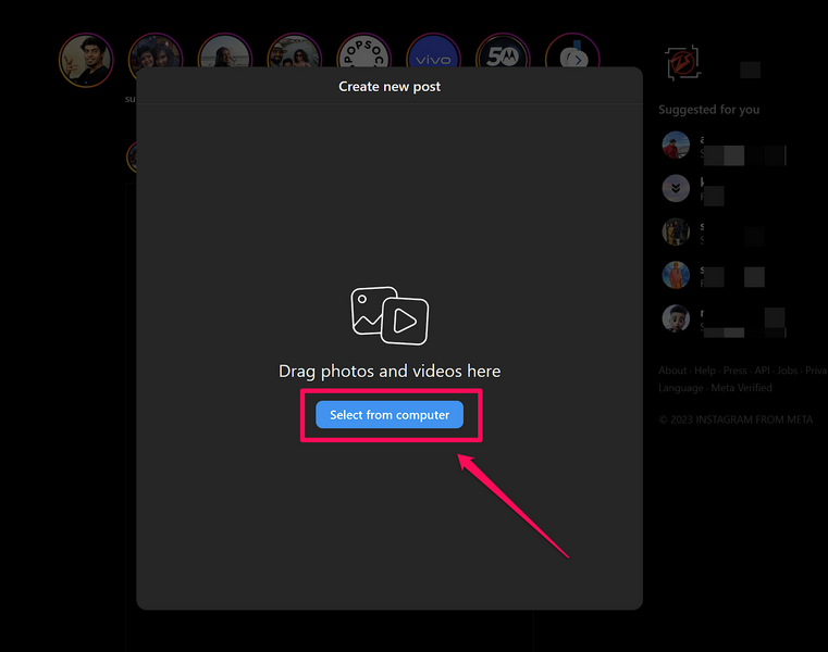 2.Most, a következő utasításon kattinthat aVálasszon a számítógéprőlgombot a számítógépen vagy a laptopján tárolt képek és videók böngészéséhez, és válassza ki azt, amelyet megosztani szeretne. Alternatív megoldásként egyszerűen csakHúzza és dobja el a média tartalmáthogy el szeretne küldeni az új bejegyzés létrehozásában.