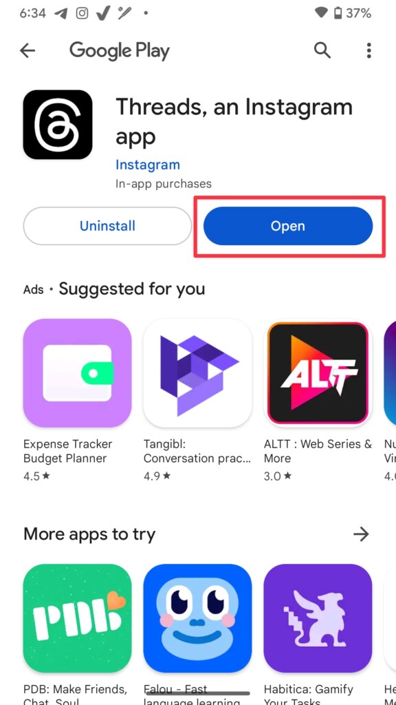 6.Érintse meg aNyitottgombot, miután letöltötte a Threads alkalmazást.