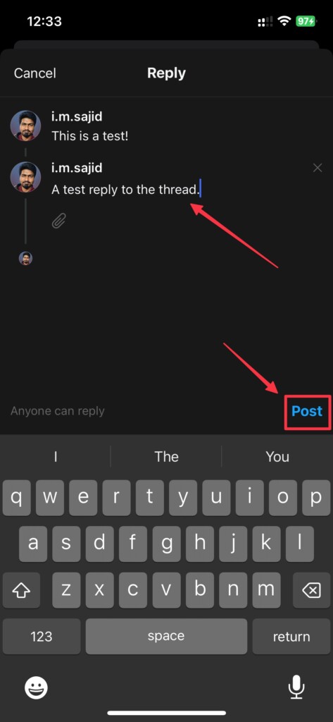 3.Írj egy szálat, amelyet meg szeretnél osztani a követőiddel. Megérintheti a lehetőséget isMelléklet (tű) ikonraalatta fotókat és videókat csatolhat a szálhoz.