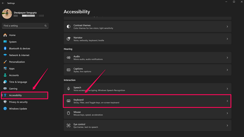 2.A bal oldali navigációs sávon kattintson aMegközelíthetőségfülre, majd kattintson aBillentyűzetopciót a jobb oldali ablaktábla Interakció szakaszában.
