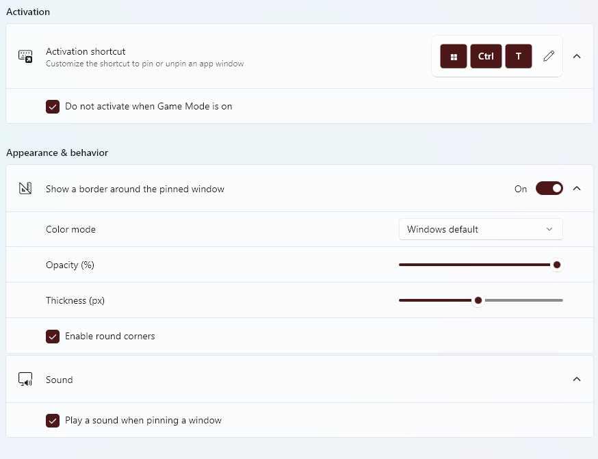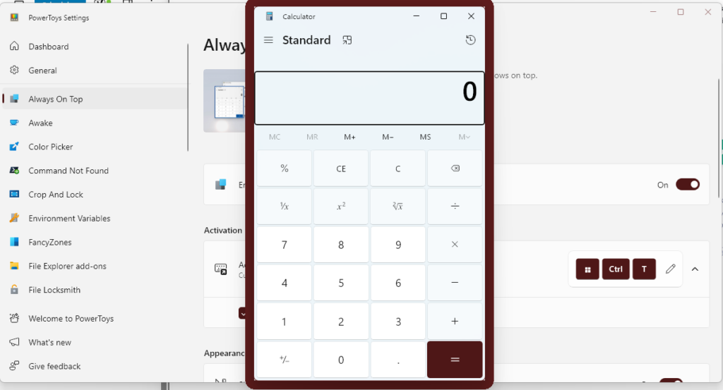 A mindig az On Top szolgáltatás már engedélyezve van a Microsoft PowerToys telepítésekor, tehát ez egy használatra kész szolgáltatás. Sőt, ha a PowerToys alkalmazás szerszámának szakaszába lép, testreszabhatja azokat a dolgokat, mint például a parancsikon gomb megváltoztatása, nem engedélyezi a szolgáltatást, amikor játék módban van, a rögzített alkalmazás körüli szegéllyel rendelkezik, a színmód megváltoztatása, az átlátszóság, a vastagság stb.