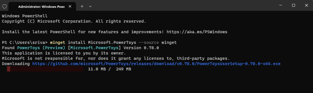 3.A PowerShell elkezdi letölteni a Microsoft PowerToys felhasználói verzióját. Nézze meg a kézi GitHub módszert, ha a gép széles alkalmazását szeretné.