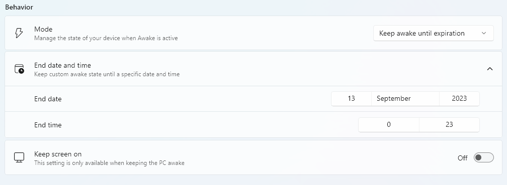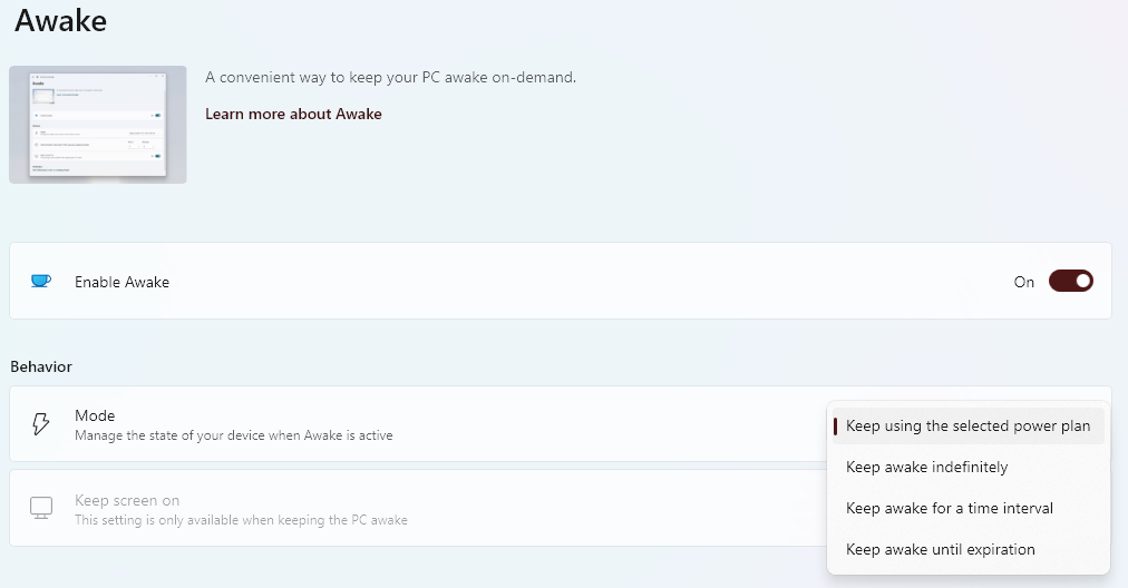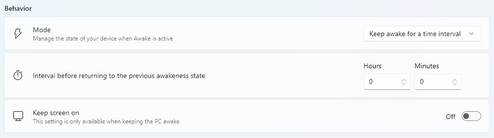 Az Awake Tool négy módot kínál: Folytassa a kiválasztott energiaterv használatát, határozatlan ideig tartson ébren, tartsa ébren egy időintervallumot, és a lejárattól kezdve ébren maradjon. Az időintervallum mód lehetővé teszi a rendszer órákig ébrenlétét,