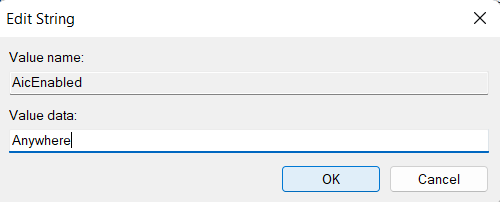 - A jobb gombbal kattintva nevezze át az értéket AicEnabled-re. Most kattintson duplán az értékének meghatározásáhozBárhol.