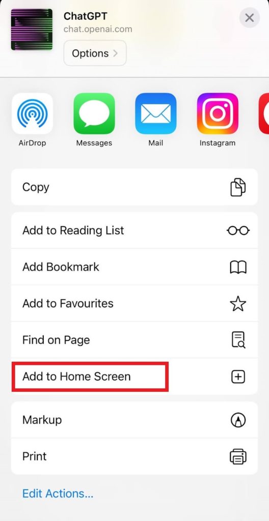 Mivel a ChatGPT számára nem érhető el önálló alkalmazás, ehelyett létrehozhat egy Safari parancsikont közvetlenül az iPhone kezdőképernyőjén. Ehhez kövesse az alábbi lépéseket: