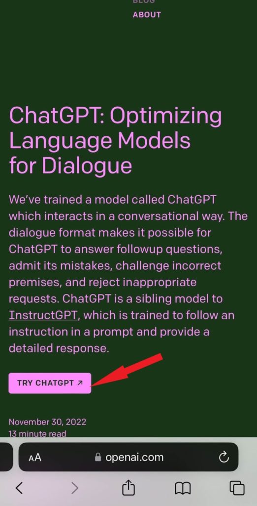 - Nyissa meg a Safari böngészőt, és írja bea címsorban, és nyomja meg a gombotEnterkulcsfontosságú. Most kattintson aPróbáld ki a ChatGPT-topció.