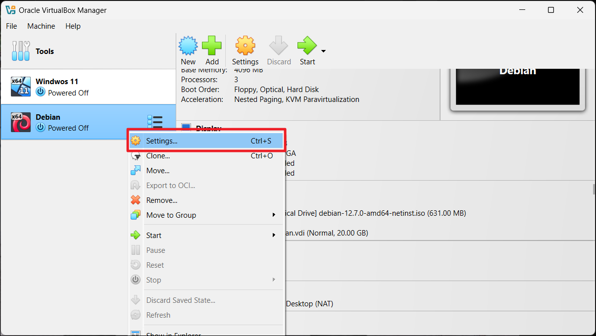 1. Kattintson a jobb gombbal az újonnan létrehozott Debian Virtuális gépre és a „Beállítások„.