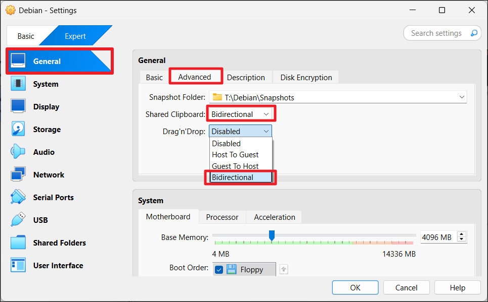 2. aÁltalánosfül, navigáljonFejlettÉs állítsa be a “Megosztott vágólap ”és "Drag'n'drop"TO"Kétirányú ”-