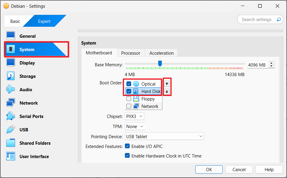 3. Váltás aRendszerfül, és használja a nyílgombokat a „Rendszerindítási sorrend ”Tehát ez “Optikai"az első és az „”Merevlemez ”a második. Győződjön meg arról, hogy az összes többi rendszerindító lehetőséget lemondják.
