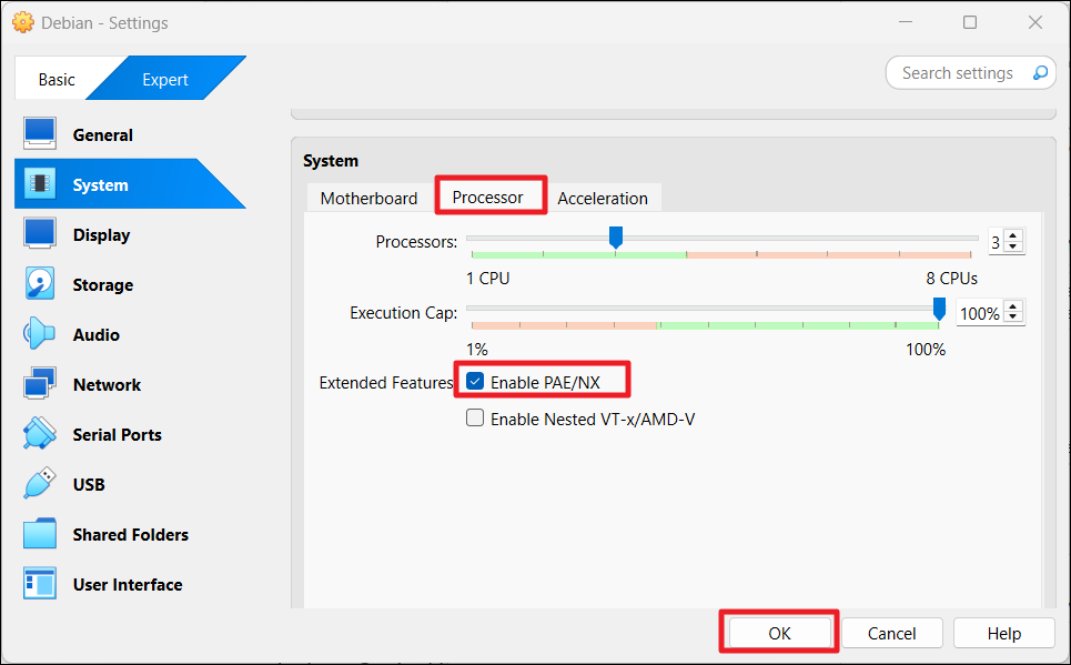 4. Váltás aProcesszorszakasz, és jelölje be a “Engedélyezze a PAE/NX -t ”opció.