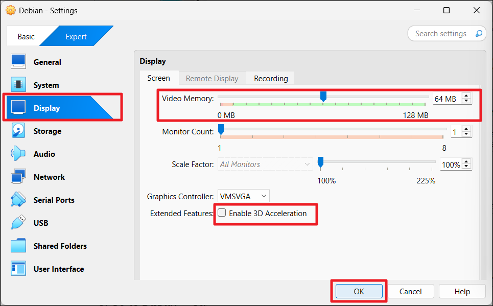 5. MenjKijelző>Képernyő, állítsa be a „Video memória ”, és törölje a jelöléstEngedélyezze a 3D gyorsítást ”-