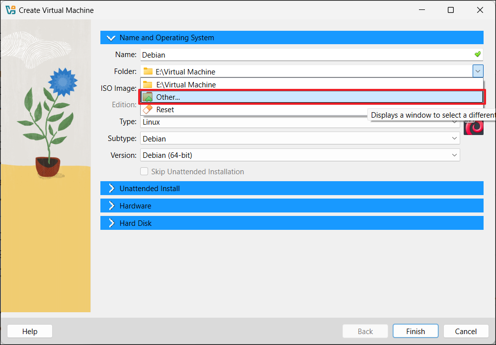 4. Válassza a “Más"AMappa ”legördülő menü. Ezután válassza ki a virtuális gép tárolását.