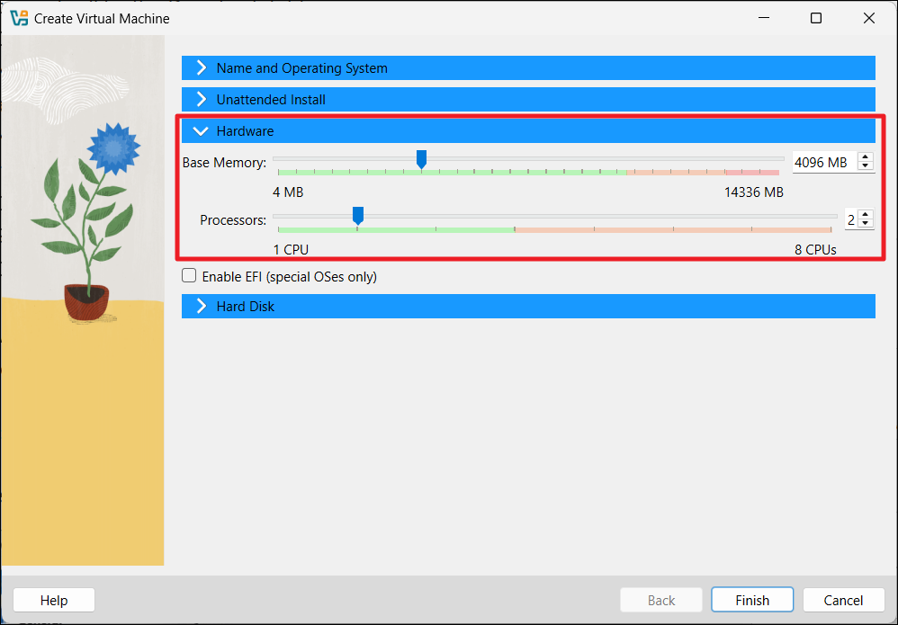 8. Válassza ki a „Hardver”Fület, és használja a csúszkát a beállításhozAlapmemóriahogy "4 GB ”ésProcesszorok-hoz2legalább.