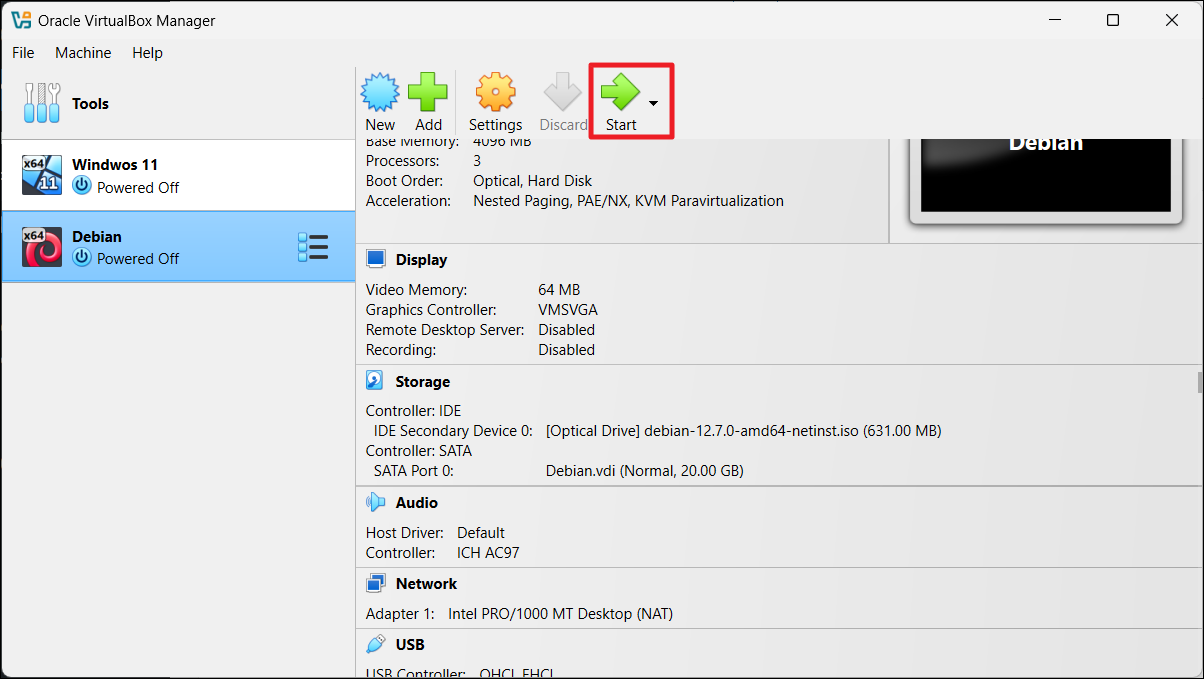 1. Válassza ki a Debian Virtuális gépet, és kattintson a “Indul„.