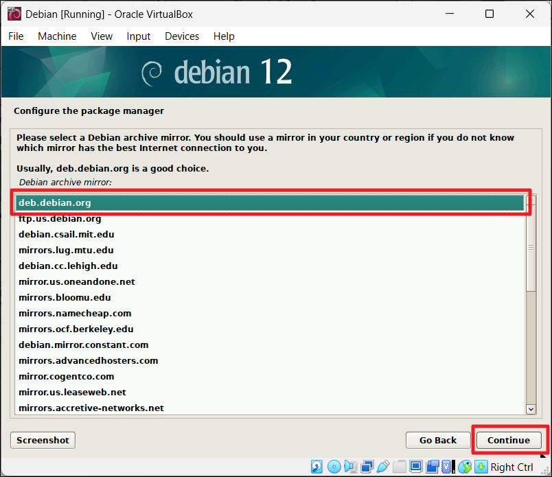 7. Válassza a „deb.debian.org"Archív tükör és"Kotinue„.