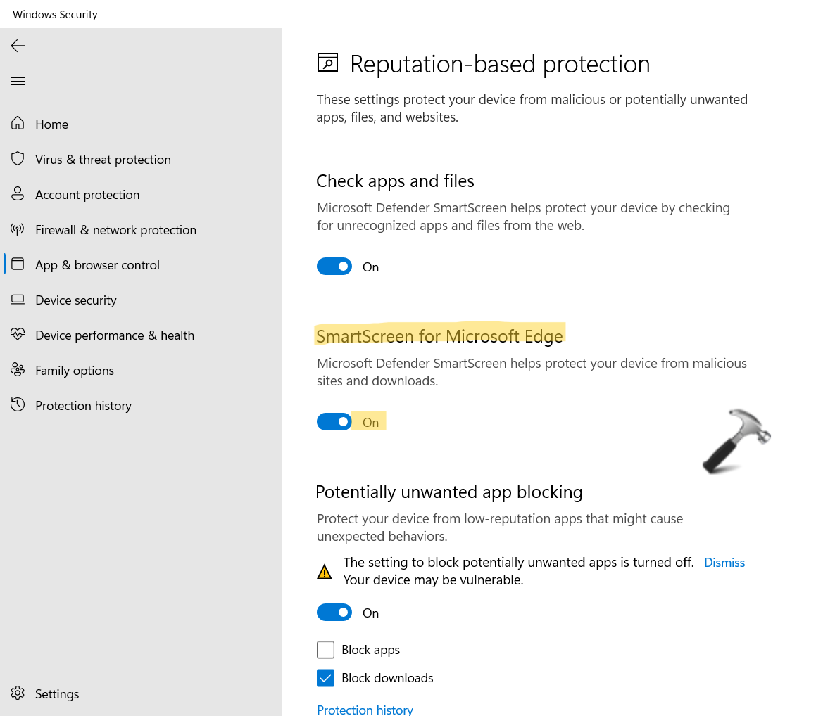 - Először is nyitottWindows biztonságmajd menj aAlkalmazások és böngészők vezérléseEzt követően kattintson a gombraHírnév alapú védelmi beállítások.