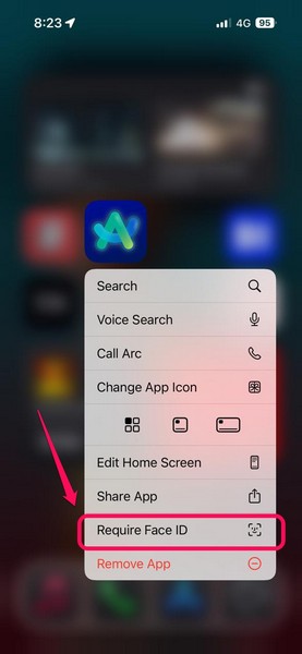 1. Érintse meg és tartsa lenyomva az alkalmazás ikonjátzárolni szeretné iPhone-ját, és válassza ki az újatArcazonosító szükséges (Touch ID szükséges iPhone SE esetén) opcióa következő helyi menüben.