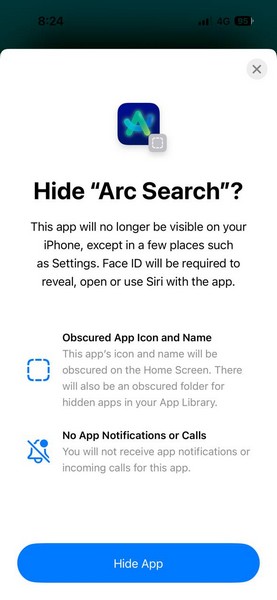 Ezenkívül, ha lezár és elrejt egy alkalmazást iPhone-ján az iOS 18 rendszerben, az nem jelenik meg egyetlen keresésben sem; sem aApp Library keresősávsem aSpotlight keresés. Az alkalmazás widgetjei (ha voltak) a Kezdőképernyőről is el lesznek távolítva. Ezeken kívül nem fog többé mindenféle értesítést kapni az iOS-eszköz rejtett alkalmazásától. Olyan lenne, mintha nem rendelkezne az alkalmazással!