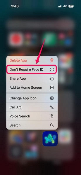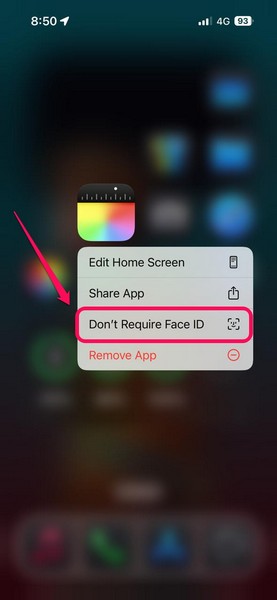 3.Jelenleg,érintse meg és tartsa lenyomva az alkalmazás ikonjátamelyet meg szeretne jeleníteni az eszközön, és érintse meg aNem szükséges Face ID/Touch ID opcióa helyi menüben.