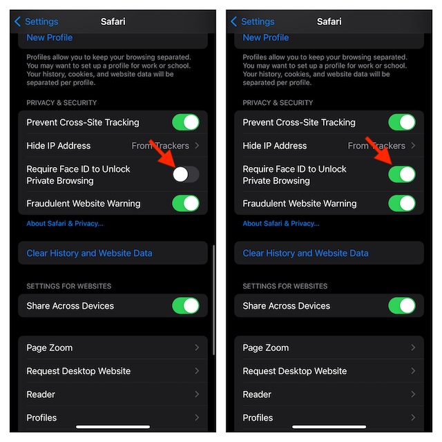 - Irány aAdatvédelem és biztonságszakaszban, és győződjön meg arról, hogy a kapcsoló mellettFace ID vagy Touch ID szükséges a privát böngészés feloldásáhozBE van kapcsolva.