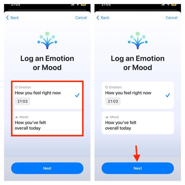 - Ezután felkérjük, hogy válassza ki aÉrzelemvagyHangulat-Érzelem: Válassza ki az érzelmeket, ha be akarja naplózni, amit most érzel.Hangulat: Válassza ki, ha be akarja naplózni, amit ma összességében érez. Válassza ki a két lehetőség bármelyikét, és érintse meg aKövetkezőgomb.
