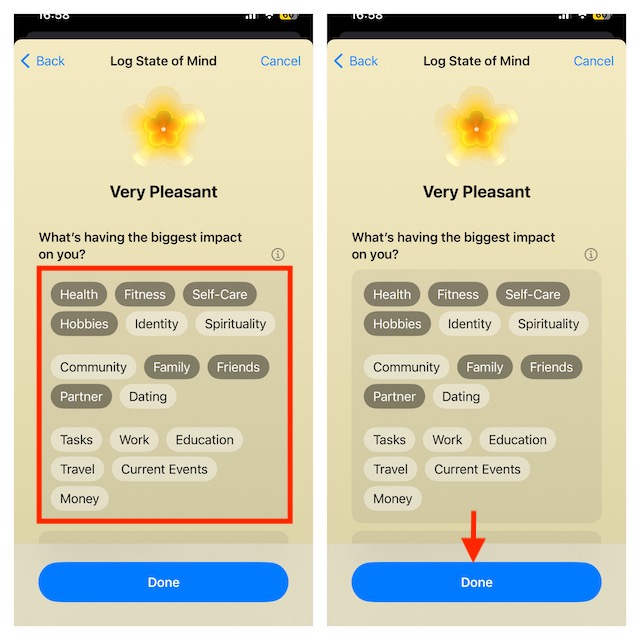 - Ezután a felszólítást kéri, hogy válassza ki a jelenlegi érzésének okait. Miután kiválasztotta az okot, érintse meg a BE gombotKész-