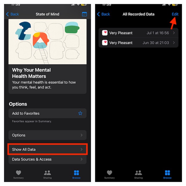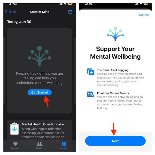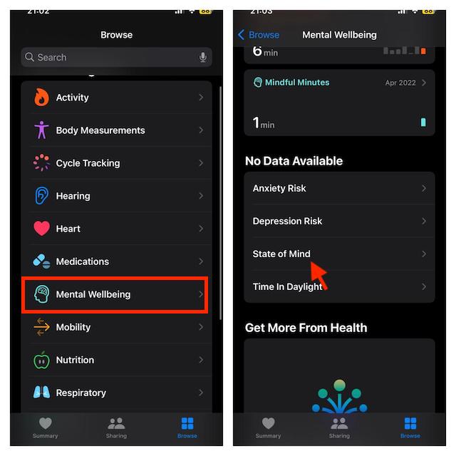 - Indítsa el aEgészségApp az iPhone -on ->BöngészőTab ->Mentális jólét->Lelkiállapot-