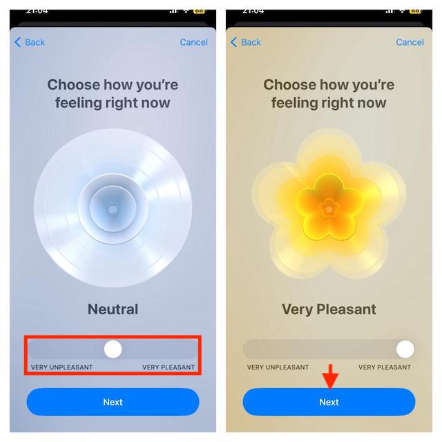 - Ezután a csúszkát balra vagy jobbra kell húznia, hogy naplózza a hangulatát vagy az érzelmeit. A bal oldalon a legtöbb leszNagyon kellemetlen, míg a jobb oldalon a legtöbb leszNagyon kellemes-