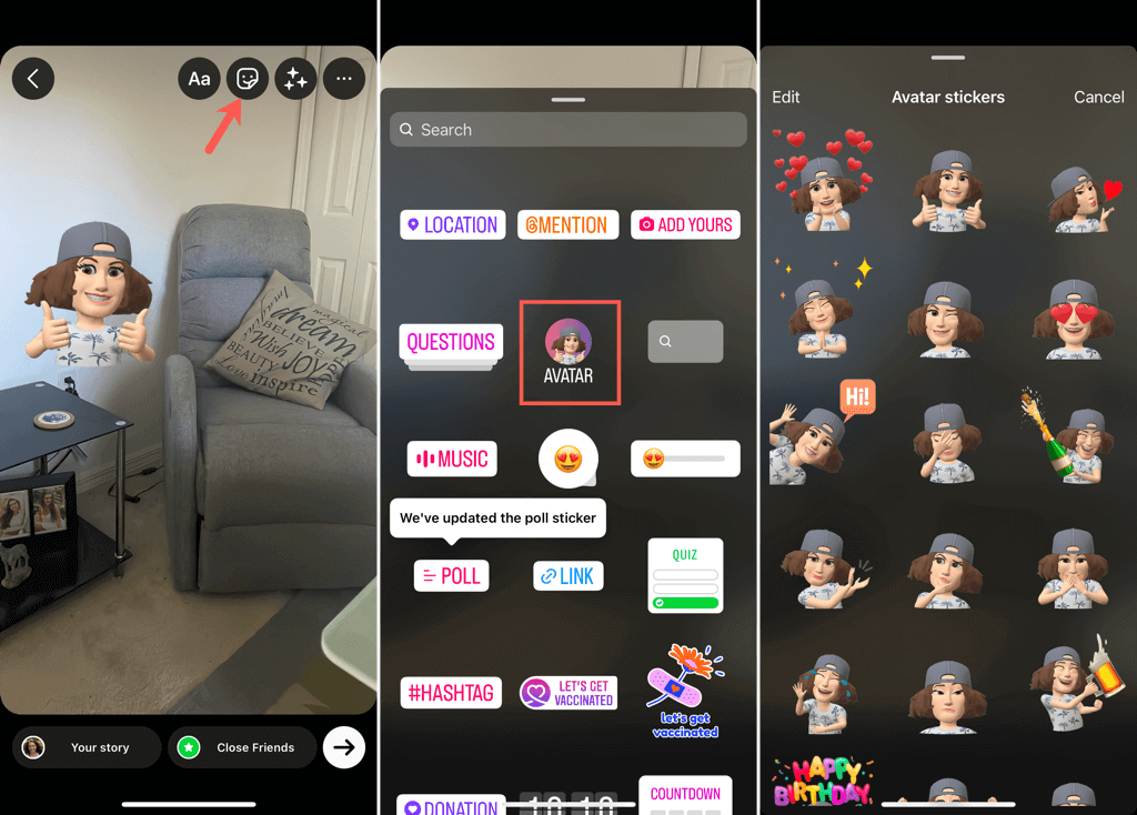 Válassza kiAvatarmajd válassza ki a használni kívánt kifejezést. A matrica az Instagram-barátodnak szóló üzenetben landol.