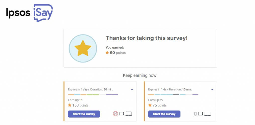 Miután elkezdi a felméréseket, gyorsan rájössz, hogy ez nem hatalmas pénzszerző. Például egy tipikus kifizetés az Ipsos Isay -nál 2500 pont egy 25 dolláros ajándékkártyaért. Ha egy 30 perces felmérés 125 pontot nyújthat, akkor huszon 30 perces felmérést kell készítenie, hogy megszerezze ezt a 25 dollárt. Ez alapvetően óránként 2,50 dollárt keres.