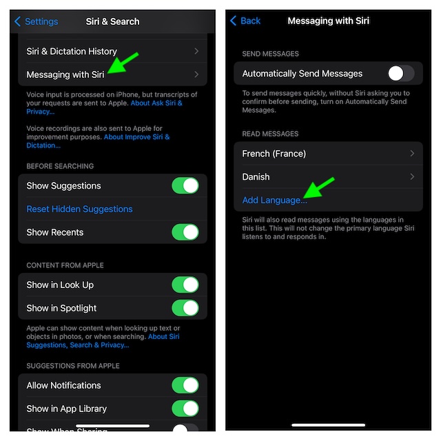 - A nyelv törléséhez indítsa el a Beállítások alkalmazást az iOS/iPados eszközön -> Siri & Search -> Messaging a Siri -vel.