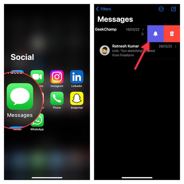 - Ezután csúsztassa balra az üzenetet, és nyomja meg a csengő ikont a csevegési szál némításának feloldásához. Igen, ezzel a módszerrel feloldhatja az összes csevegési szál némítását.
