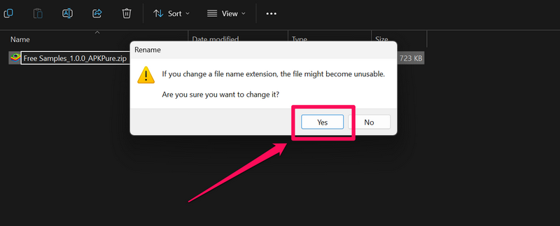 5.A következő utasításon a Windows 11 azt fogja mondani, hogy az APK fájl átnevezése (és konvertálása) felhasználhatatlanná teheti a platformon. Kattintson aIgen gombA művelet megerősítéséhez.