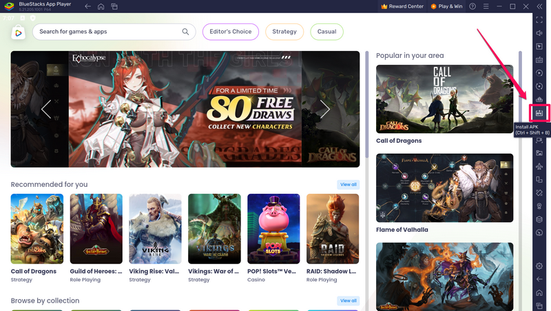 10.Ezután rákattinthat aTelepítse az APK gombotaJobb menüsor- Alternatív megoldásként megnyomhatja a Ctrl + Shift + B gombot, hogy ugyanazt a műveletet hajtsa végre a Bluestacks -en.