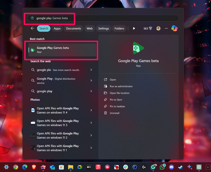 7.Most használja a Windows + S -t a megnyitáshozWindows Search,Keresse meg a Google Play Games alkalmazást, ésKattintson rá a megnyitáshoz-