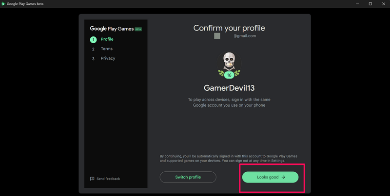 10.Válassza ki a meglévő Google Play Games profilját, vagy váltson egy másikra. Kattintson aJól néz ki gombAmikor kész vagy.