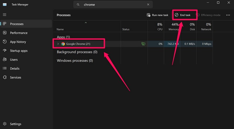 2.Ne felejtsd elVégezze el a krómhoz kapcsolódó összes háttérfolyamatotaFeladatvezetőA Windows 11 eszközén.