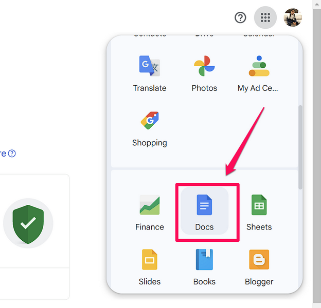 4. Görgessen le egy kicsitA következő legördülő ablakban a megtaláláshozDokumentumokésKattintson ráA Google Docs megnyitásához egy új lapon.