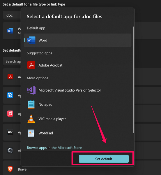 5.Ha nem az, akkorKattintson a program nevére, válasszonSzóA következő párbeszédpanelen, és nyomja meg aÁllítsa be az Alapértelmezett gombot-