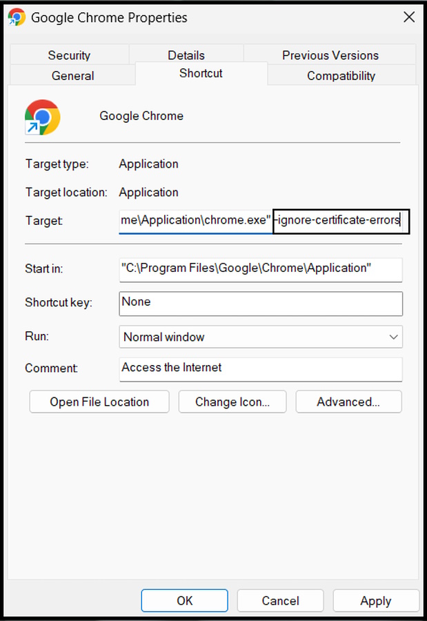 Ha elkészült, nyissa meg a Google Chrome-ot ezen a parancsikonon keresztül, és könnyen elérheti a nem biztonságos webhelyeket. Azonban mindig ezt az újonnan létrehozott parancsikont kell használnia a nem biztonságos webhelyek eléréséhez a Google Chrome-ban, különben nem tudja megnyitni azokat.