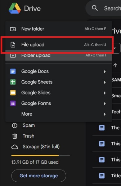 3.A legördülő menüben válassza ki aFájl feltöltési opció-
