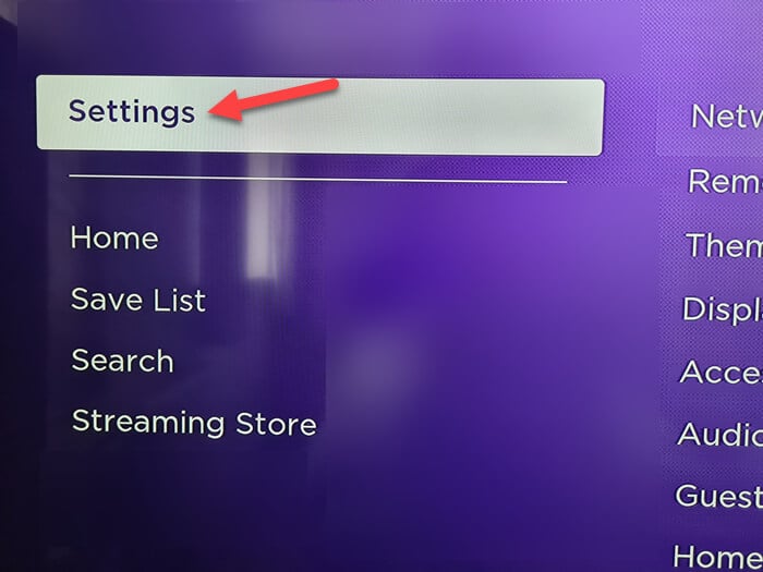 - Balra vagy jobbra görgetve érje el a Roku beállításait, amíg meg nem találja aBeállításokopció a képernyőn, és válassza ki.
