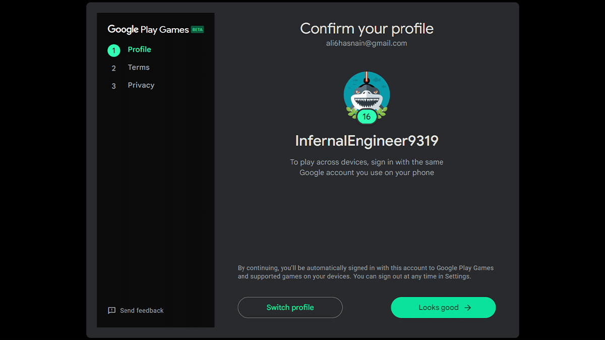 - Hozzon létre egy játékprofilt> kattintson aProfil létrehozásagomb> Kattintson a “Jól néz ki”Gomb.