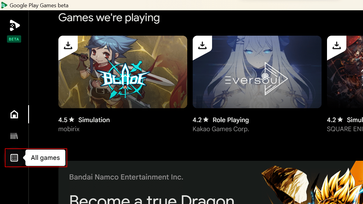 Noha a Google Play Games alkalmazás egy előnézet, mint béta letöltés, továbbra is hozzáférést biztosít számos játékhoz, például az 1945 -ös légierő, a Blade Idle, a Cookie Run: Kingdom és az Evony: A King's Return. A katalógusnak csak egy maroknyi játék van, de a Google továbbra is további címeket fog hozzáadni.